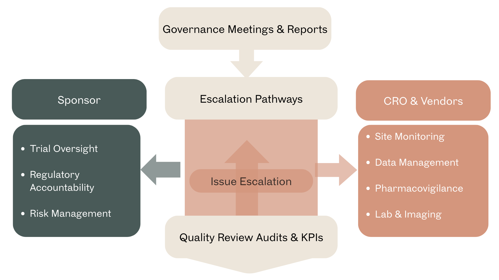 Figure 2 – CRO Oversight Governance Model: A flow diagram showing the sponsor’s oversight responsibilities relative to CRO functions, highlighting review cycles, escalation pathways, and quality control points.